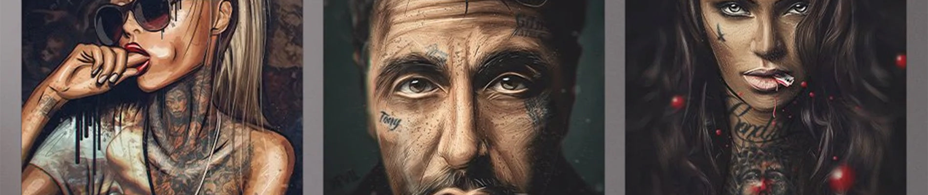 Abstrakte Bilderwände mit Tattoo Motive passen sehr gut in eine Loft Wohnung, Wohnzimmer oder Bars. Kombiniere mit anderen Motiven aus der Affengeile Bilder Auswahl.