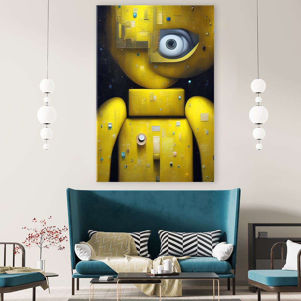 Tauche ein in die Welt der abstrakten Kunst mit diesem fesselnden Motiv. Eine gelbe Figur erhebt sich aus einer Komposition verschiedener geometrischer Formen, die miteinander verschmelzen und eine faszinierende Struktur bilden. Ein einzelnes Auge, das die Figur gekonnt betont, fängt den Blick des Betrachters ein. Dieses abstrakte Motiv mit der gelben Figur auf dunklem Hintergrund ist ein Blickfang in jedem Raum.