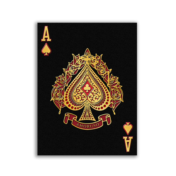 Ein markantes Pik Ass auf schwarzem Hintergrund fesselt den Blick. In dunklem Rot erstrahlt das Pik-Symbol, während es von Konturen im Goldlook umrahmt wird. Diese kraftvolle Spielkarte verkörpert Stärke und Dominanz. Ein außergewöhnlicher Blickfang für deine Wand im Wohnzimmer, Schlafzimmer oder Büro.