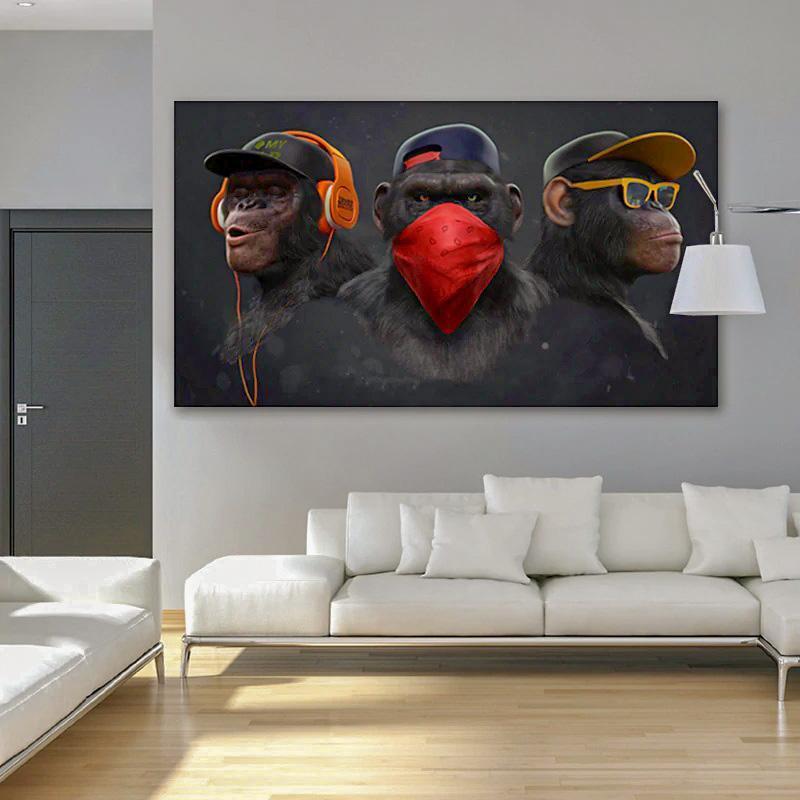 Auf dem Motiv findest du links einen Affe "nichts hören" mit einer Baseball Mütze und einem orangenen Kopfhörer. In der Mitte befindet sich der Affe "nichts sagen" mit einem roten Tuch und der rechte Affe "nichts sehen" hat einer gelben Brille und Baseball Cap auf.