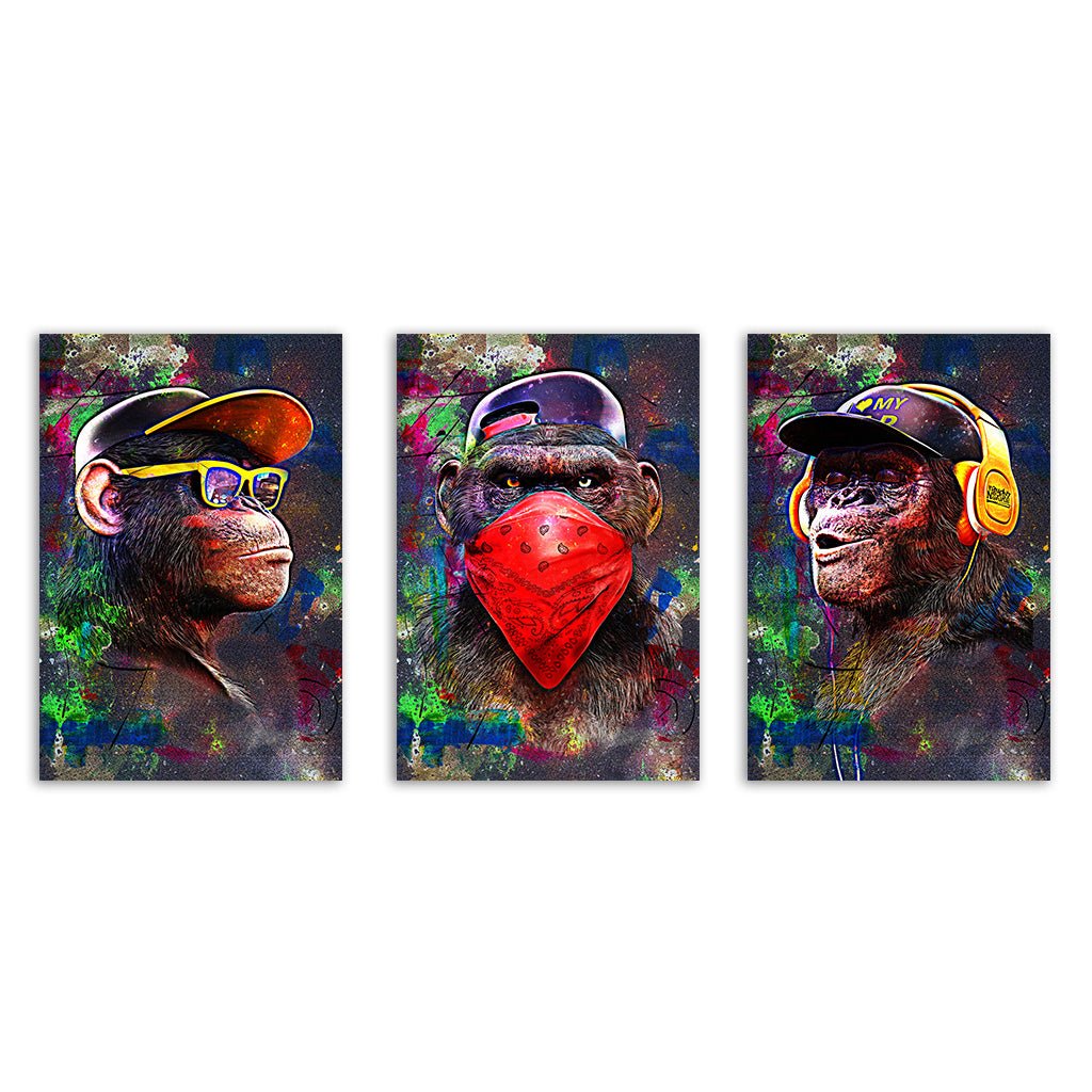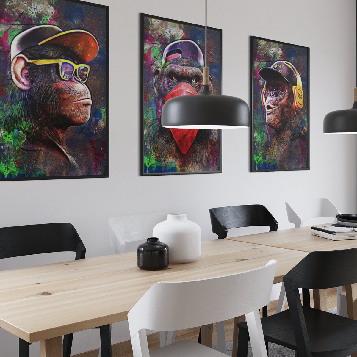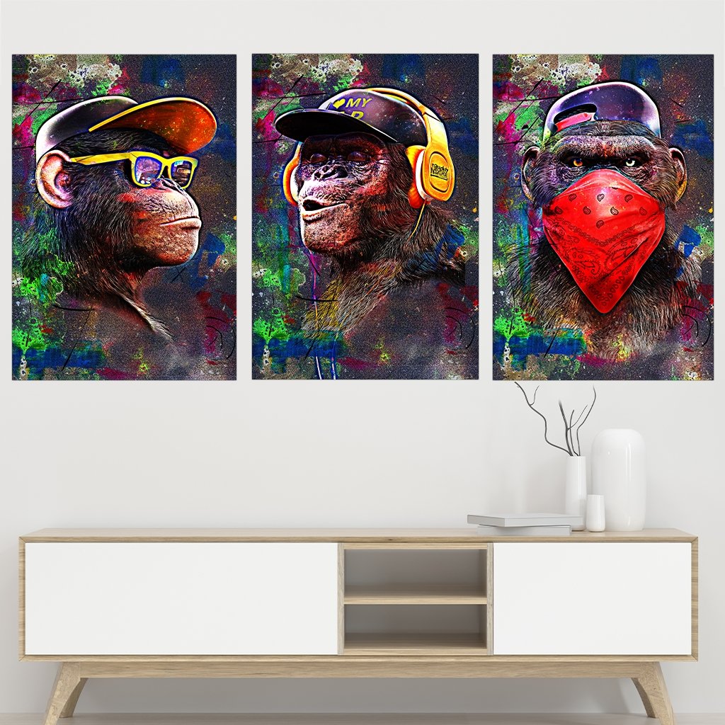Unser Bestseller "Affengeil" gibt es nun auch als Triptychon.Die Historie kommt aus Japan und bedeutet „nichts sehen, nichts hören, nichts sagen“. Auf dem Motiv findest du einen Affen "nichts hören" mit einer Baseball Mütze und einem orangenen Kopfhörer, einen Affe "nichts sagen" mit einem roten Tuch und einen Affe "nichts sehen" hat eine gelbe Brille und Baseball Cap auf.