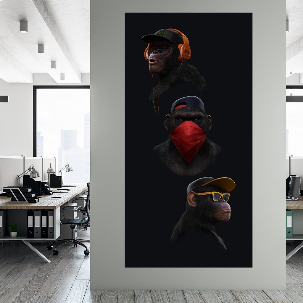 Die Historie des Motiv's mit den 3 Affen kommt ursprünglich aus Japan und bedeutet „nichts sehen, nichts hören, nichts sagen“. Auf dem Motiv findest du oben einen Affe "nichts hören" mit einer Baseball Mütze und einem orangenen Kopfhörer. In der Mitte befindet sich der Affe "nichts sagen" mit einem roten Tuch und der untere Affe "nichts sehen" hat einer gelben Brille und Baseball Cap auf. Perfekt für dein Wohnzimmer.