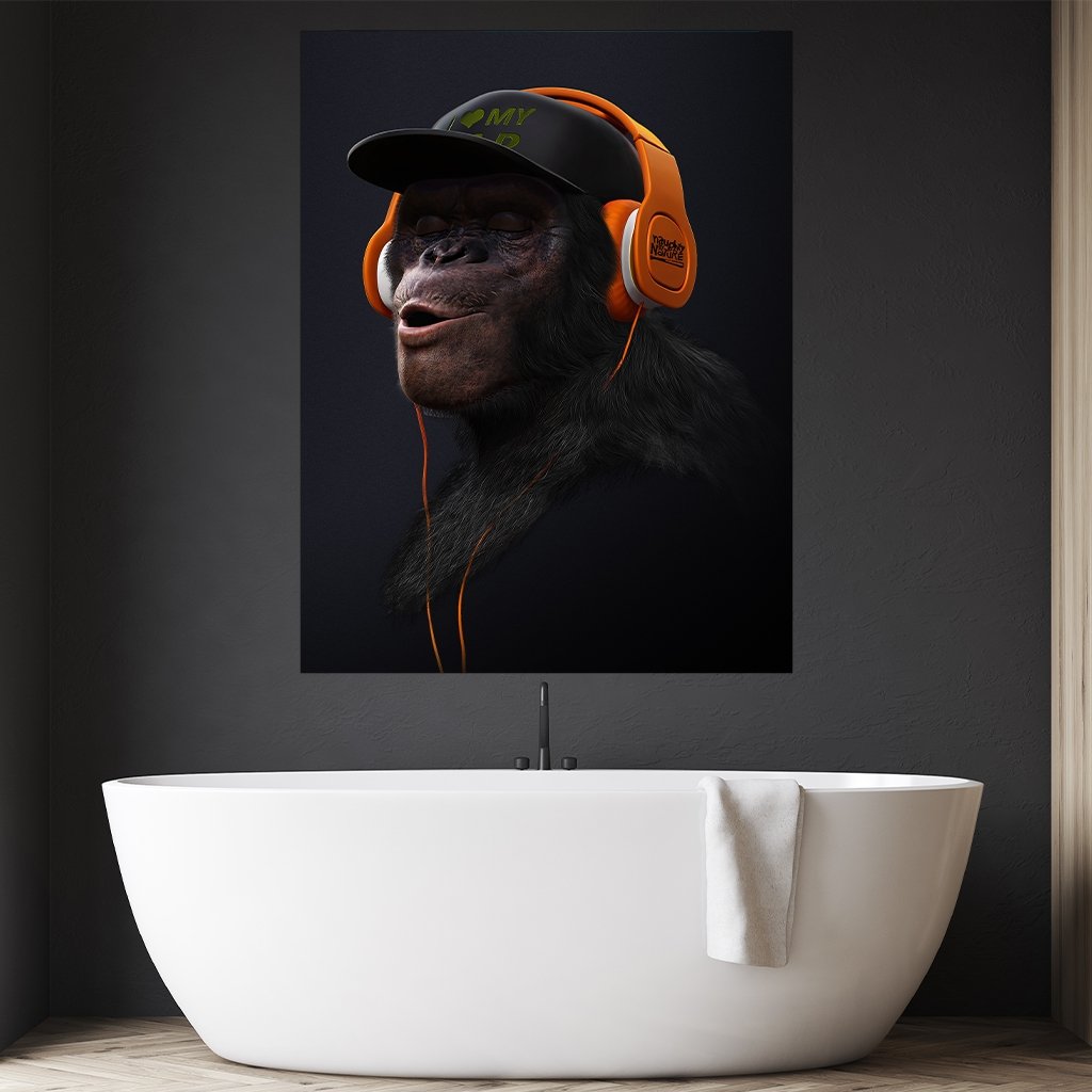 Auf dem Motiv findest du einen Schimpanse (Affe) mit einer Baseball Mütze und einem orangenen Kopfhörer. Es bedeutet "nichts hören".
