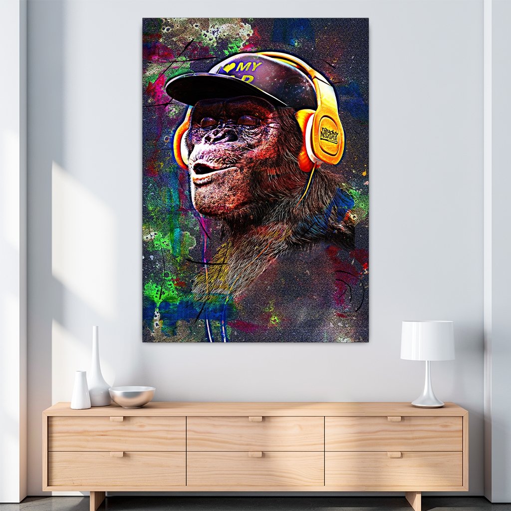 Du kannst von unserem Bestseller "Affengeil" das Motiv "Affengeil Kopfhörer" auch als abstaktes Einzelbild erwerben. Auf dem Motiv findest du einen Schimpanse (Affe) mit einem orangenen Kopfhörer. Es bedeutet "nichts hören".