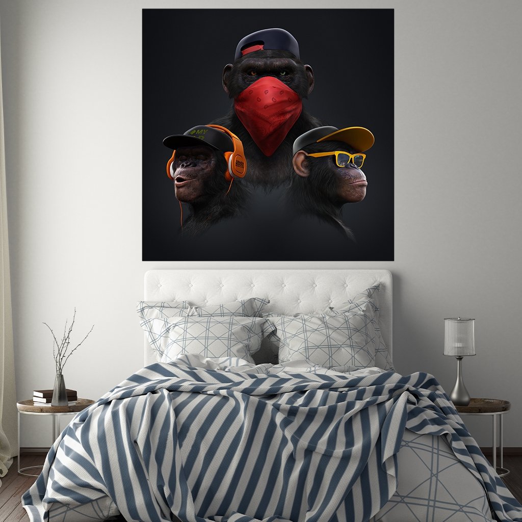 Auf dem Motiv findest du links einen Affe "nichts hören" mit einer Baseball Mütze und einem orangenen Kopfhörer. In der oberen Mitte befindet sich der Affe "nichts sagen" mit einem roten Tuch und der rechte Affe "nichts sehen" hat einer gelben Brille und Baseball Cap auf.