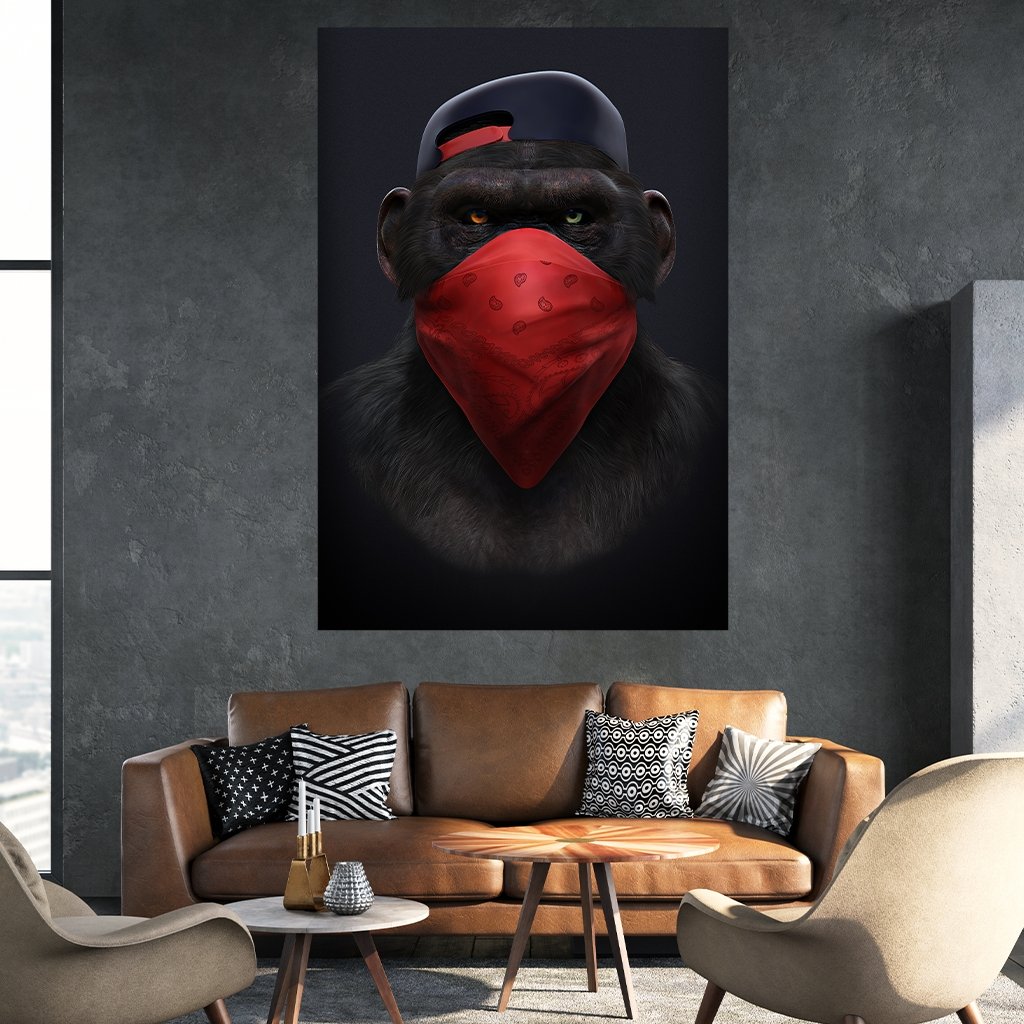 Du kannst von unserem Bestseller "Affengeil" das Motiv "Affengeil Tuch" auch als Einzelbild erwerben. Auf dem Motiv findest du einen Schimpanse (Affe) mit einem Basecap und einem roten Tuch. Es bedeutet "nichts sagen".