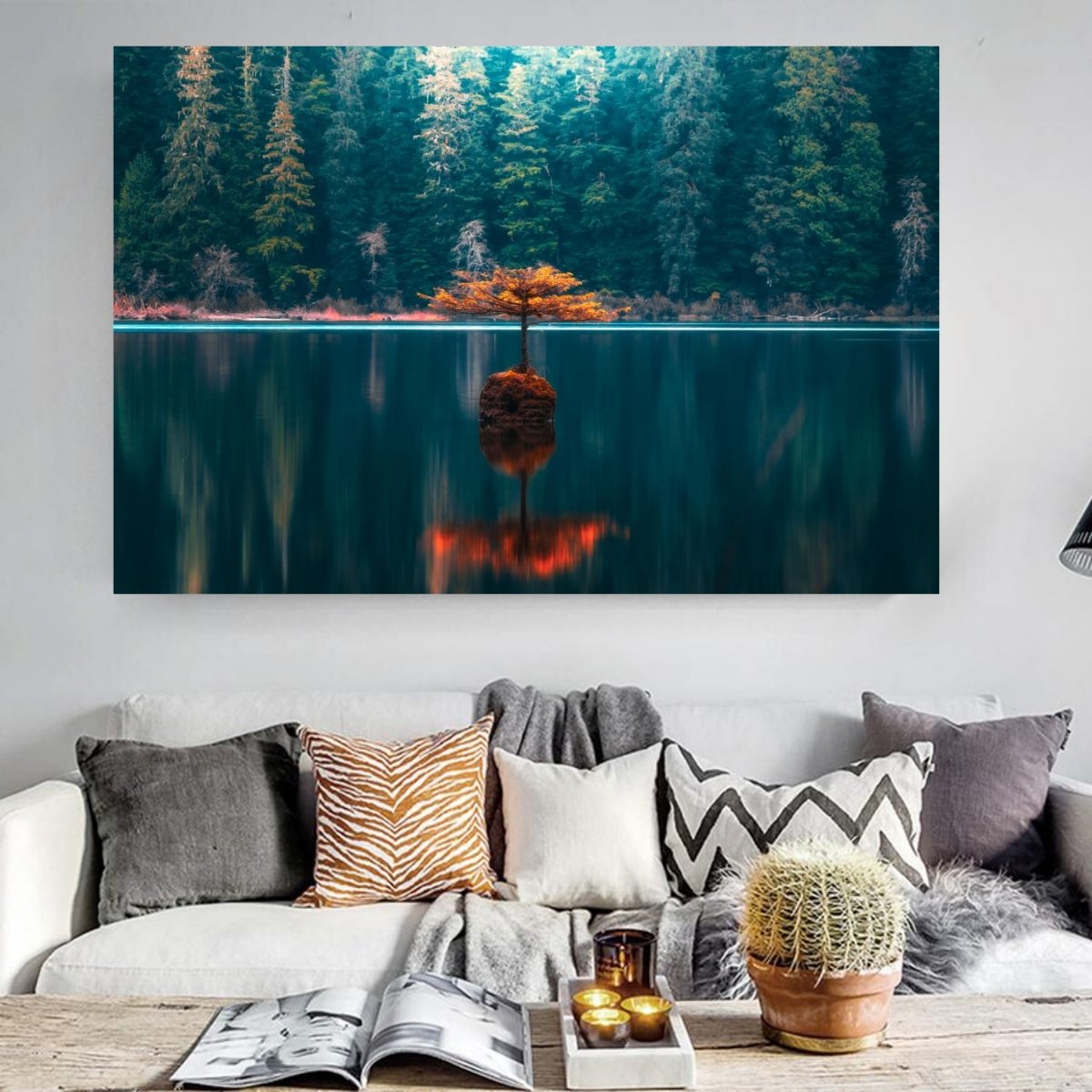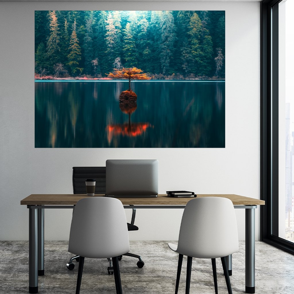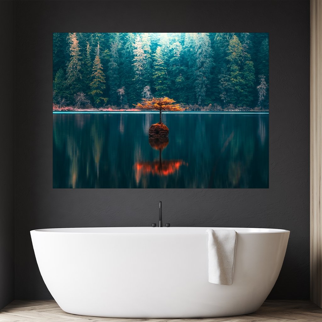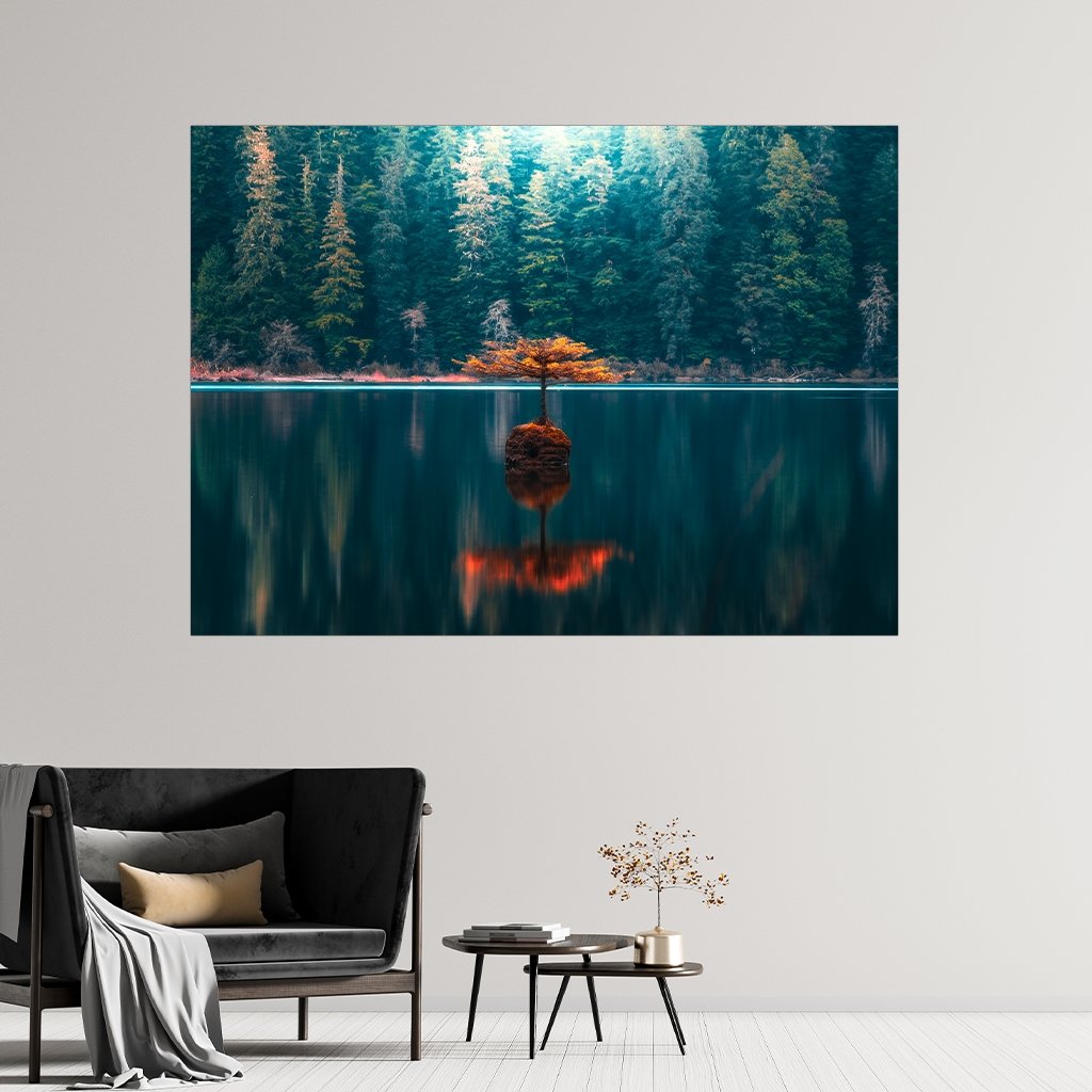 Alone. Einsam. Ein alleinstehender Baum im Herbst in Mitten eines Sees dessen Blätter sich rot verfärben. Stille um ihn herum. Allein, aber dennoch umgeben von anderen Bäumen. Ein jeder kennt dieses Gefühl. Dieses Motiv zeigt Zufriedenheit und Ruhe. Genieße dieses Bild und atme einmal tief durch in deinem Wohnzimmer, Schlafzimmer oder auch Flur und genieße den Moment der Ruhe.