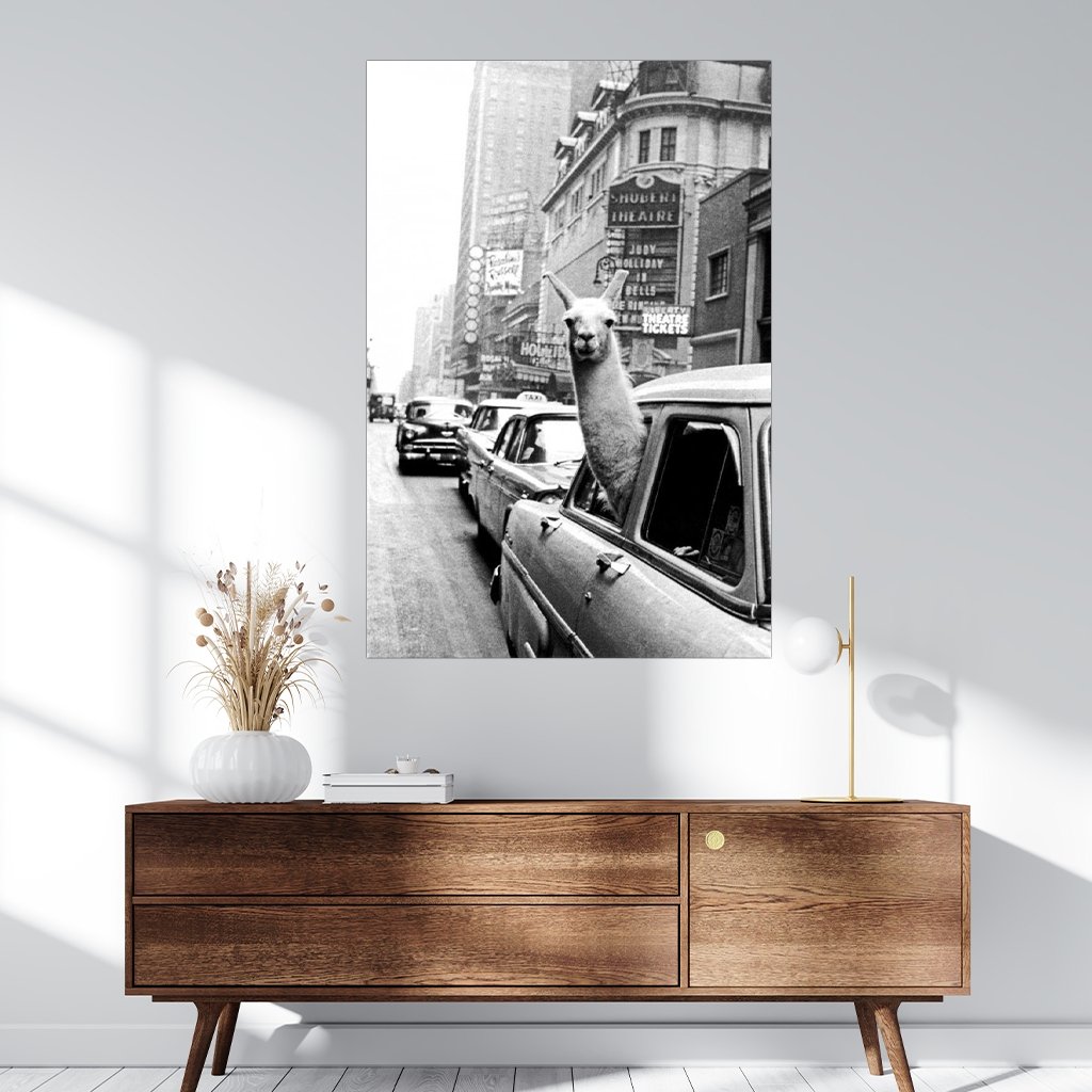 Da traut man seinen Augen nicht... Ein Alpaka schaut aus der Fensterscheibe eines Autos mitten in der Großstadt. Ein toller Schnappschuss und Muss für deine Wände.