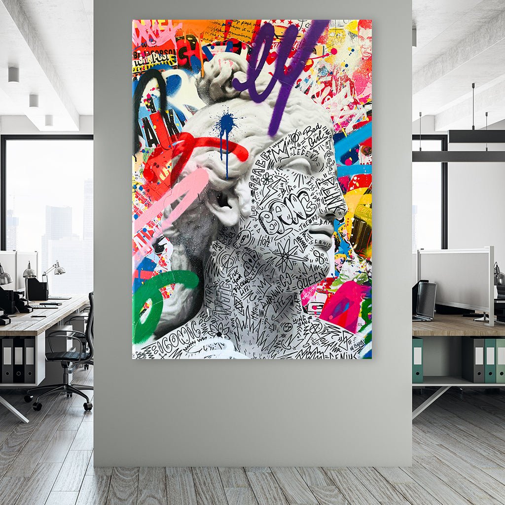 Notre image montre une sculpture classique recouverte d'une multitude d'éléments de graffiti et de motifs d'art urbain moderne. La sculpture elle-même est en noir et blanc, tandis que l'arrière-plan et les graffitis ajoutés sont réalisés dans des couleurs vives telles que le rouge, le bleu, le vert et le rose. Les graffitis consistent en divers lettrages, dessins et gribouillis répartis sur le visage et le corps de la sculpture. Cette combinaison d'art traditionnel et d'art urbain moderne crée un fort contraste visuel et confère à l'image un effet dynamique et provocateur.