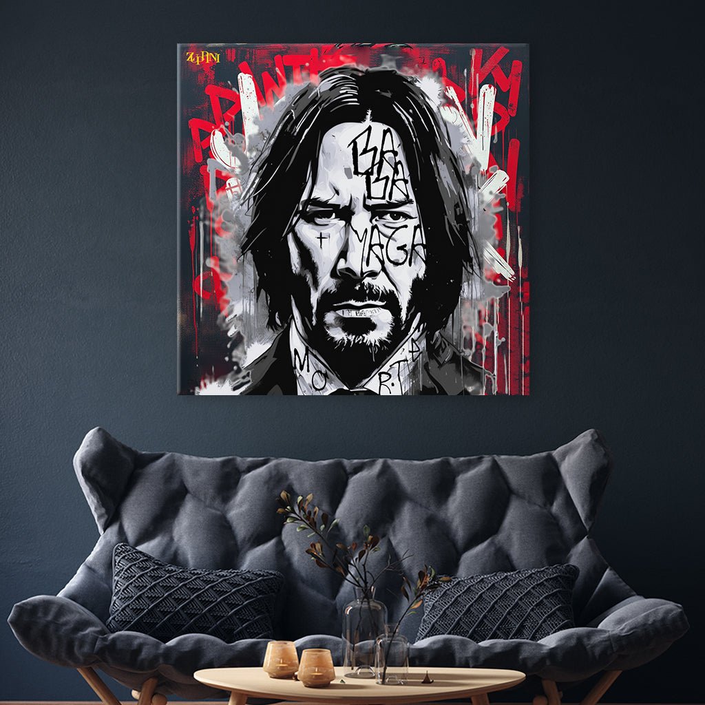 Stilisiertes Porträt von Keanu Reeves als John Wick. Sein Gesicht ist mit auffälligen Graffiti-Schriftzügen wie "BABA YAGA" versehen, was auf den Charakter anspielt. Der Hintergrund ist eine Mischung aus Grau- und Rottönen mit weißen und roten Graffiti-Elementen, die einen chaotischen und intensiven Eindruck vermitteln.