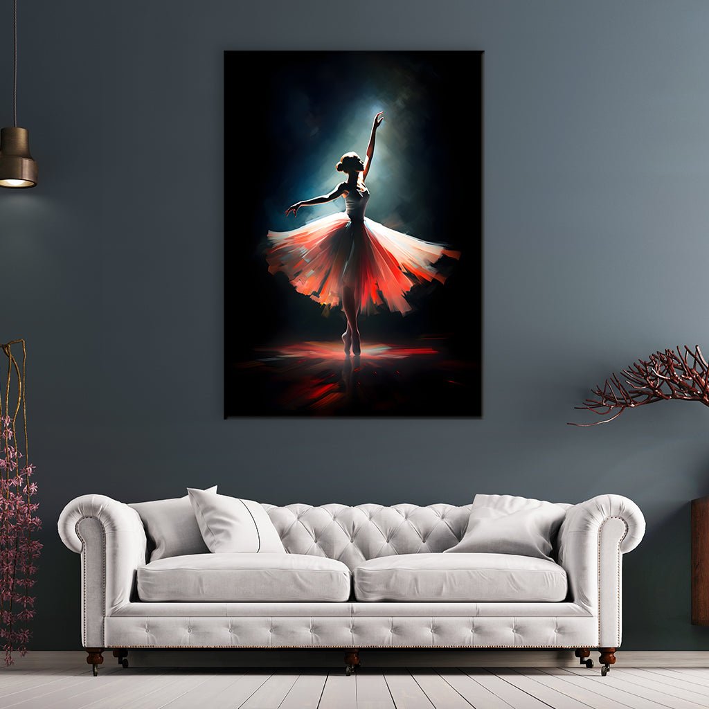 Inmitten der Dunkelheit erstrahlt eine Ballerina in einem zarten rosa Tüllkleid. Das Gemälde im dynamischen Acrylstil fängt die Anmut ihres Tanzes ein, während ein Lichtstrahl ihre Eleganz hervorhebt. Die Kontraste zwischen Licht und Dunkelheit verleihen diesem Kunstwerk eine besondere Tiefe.