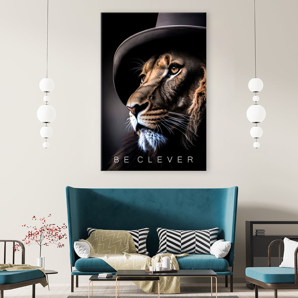 Ein inspirierendes Bild präsentiert einen Löwen, gekleidet mit einem klassischen Hut, und darunter prangt der ermutigende Schriftzug "be clever". Dieses Motiv erinnert daran, dass Intelligenz und Klugheit die Schlüssel zum Erfolg sind. Der Löwe symbolisiert dabei Mut und Entschlossenheit, während die Botschaft dazu ermutigt, kluge Entscheidungen zu treffen und Weisheit auf dem Weg zum Erfolg einzusetzen.