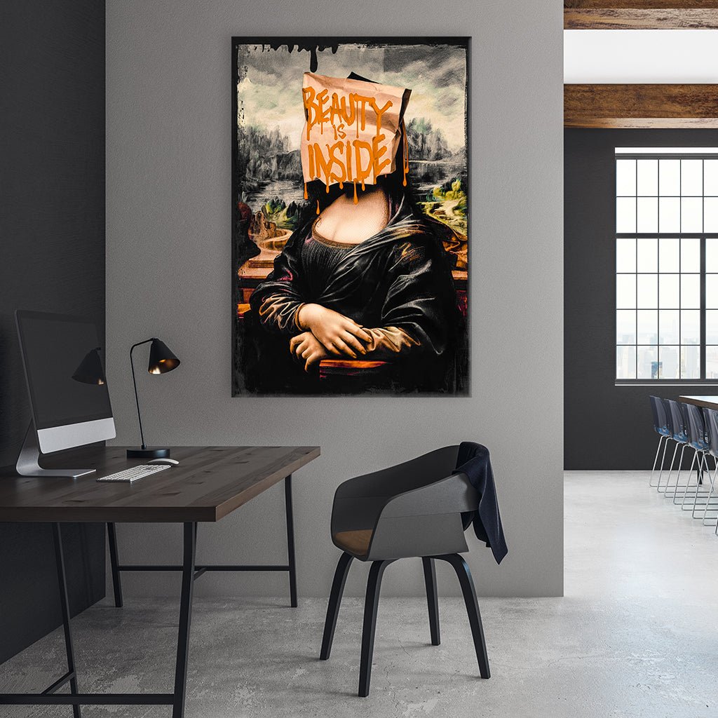 Eine moderne Interpretation der Mona Lisa, deren Gesicht durch eine braune Papiertüte verdeckt ist. Auf der Tüte steht in leuchtend orangefarbener Schrift „BEAUTY IS INSIDE“, wobei die Farbe tropft und einen grafischen Effekt erzeugt. Der klassische Hintergrund und die Pose der Mona Lisa bleiben erhalten, jedoch kontrastiert die Botschaft auf der Tüte mit der traditionellen Darstellung. Die Kombination aus alt und neu vermittelt eine kritische Reflexion über Oberflächlichkeit und innere Werte.
