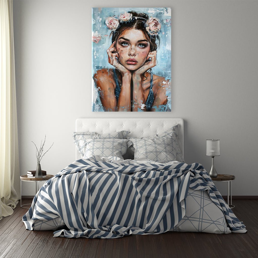 Das Motiv zeigt ein beeindruckendes Porträt einer jungen Frau, das durch seine künstlerische Umsetzung in Acrylmalerei besticht. Ihr Gesicht dominiert das Bild und ist von einer faszinierenden Mischung aus Realismus und abstrakten Elementen geprägt. Die Frau hat große, ausdrucksstarke Augen, die den Betrachter direkt anblicken. Ihre Lippen sind voll und rosig, und auf ihren Wangen und der Nase sind zarte Sommersprossen zu sehen.