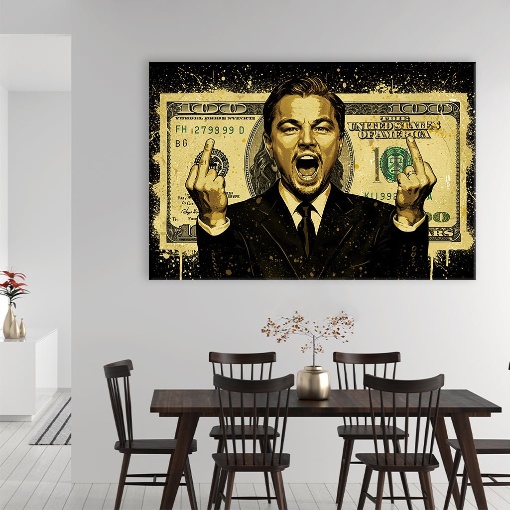 Dieses Bild porträtiert Leonardo DiCaprio in seiner Rolle als Jordan Belfort in "The Wolf of Wall Street" vor einem schwarzen Hintergrund mit einer hundert Dollarnote. Die Farben sind in Schwarz in Goldton gehalten. Das Motiv strahlt Macht und Schadenfreude aus.