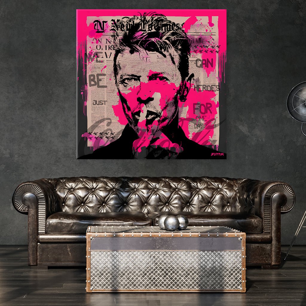 Das Bild zeigt ein markantes, schwarz-weißes Porträt von David Bowie, der einen Finger auf den Mund legt. Das Porträt ist stark von leuchtend pinken Farbspritzern und Graffiti-Elementen überlagert, die auch seine Augenpartie und die Lippen bedecken. Der Hintergrund besteht aus Zeitungsartikeln, auf denen teilweise "The New York Times" und "WE CAN BE HEROES FOR ONE DAY" zu lesen ist.