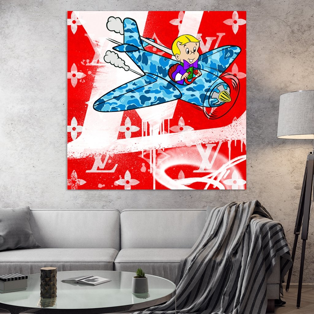 In diesem farbenfrohen Szenario fliegt eine Comicfigur in einem blauen Camouflage-Flieger über einen auffälligen rot-weiß gestalteten Hintergrund. Der markante Kontrast zwischen der dynamischen Flugszene und den ikonischen Louis Vuitton-Logos erzeugt eine einzigartige Ästhetik.