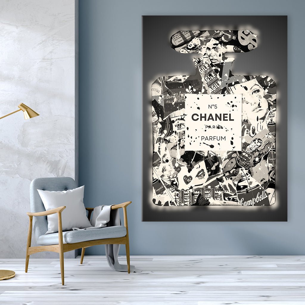 Améliorez votre humeur avec ce motif exceptionnel. Le parfum Chanel N°5 de Paris est représenté dans ce motif sous forme de graffiti sur fond noir. Le noir et blanc donne à l'image un aspect accrocheur dans votre intérieur (chambre à coucher, couloir, salon ou même bureau).