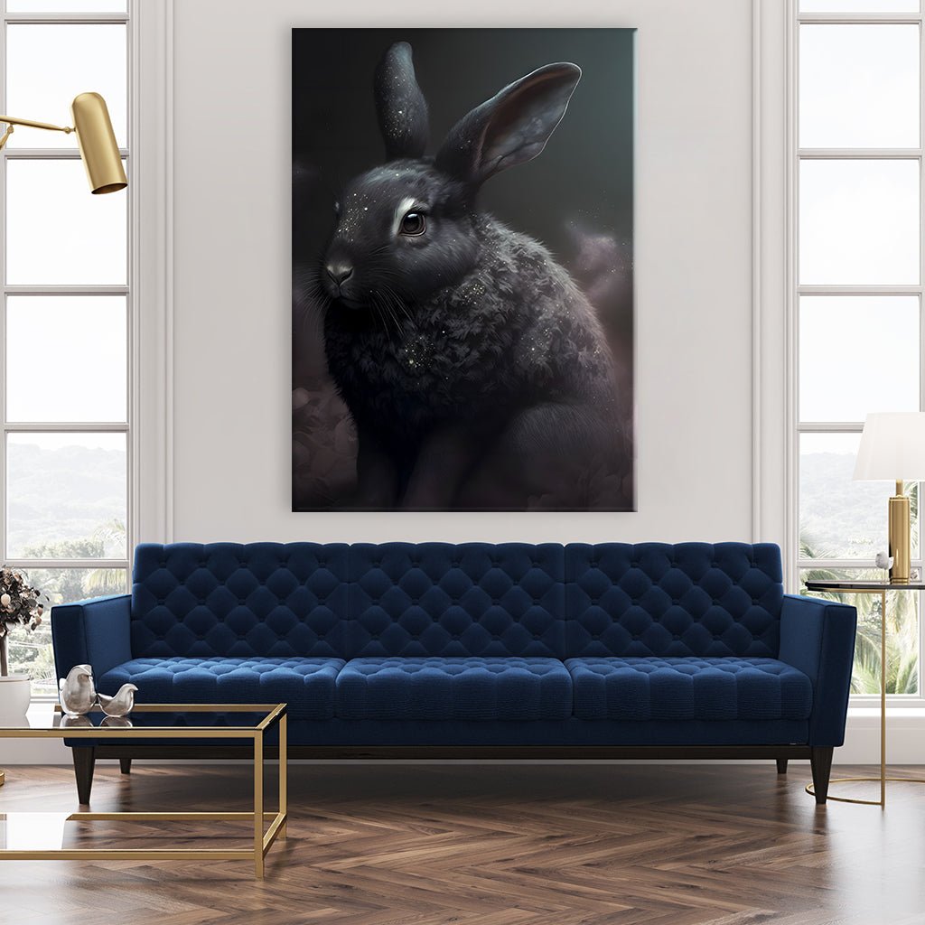 Ein kleiner pechschwarzer Hase sitzt im mystischen Nebel, der um ihn herum wabert. Sein Fell ist mit kleinen Goldpartikeln versehen, die im schwachen Licht funkeln. Trotz seiner geringen Größe strahlt der Hase eine ruhige und mysteriöse Aura aus.