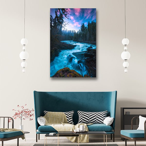 Erlebe die beeindruckende Schönheit der Natur mit dieser faszinierenden Fotografie. Das Bild zeigt einen Fluss mit reißender Strömung, der durch einen malerischen Wald fließt. Die lebendigen Farben und die atemberaubende Beleuchtung schaffen eine einzigartige Atmosphäre und lassen den Betrachter in die Natur eintauchen.