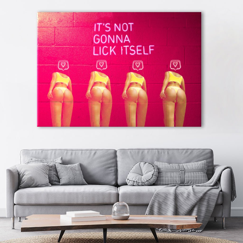 Das in Pink gehaltene Motiv mit den vier Damen in Gelb ist ein Statement und Hinweis den man auch im auffallenden Schriftzug im Neonstil wiederfindet. Es ist ein außergewöhnlicher Hingucker für dein Schlafzimmer, Wohnzimmer, Büro oder Flur.