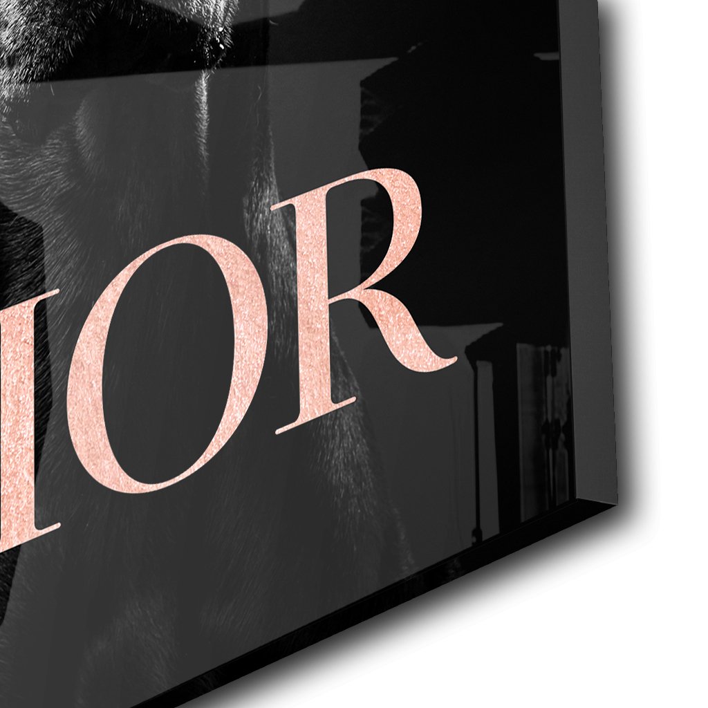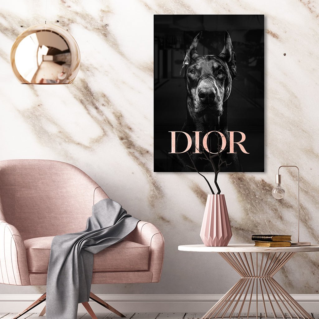 Ein eindrucksvolles Schwarz-Weiß-Foto zeigt einen Dobermann in Nahaufnahme. Im unteren Bildbereich prangt groß der Schriftzug "DIOR" in Roségold. Diese Kombination aus dem eleganten Hund und der renommierten Marke strahlt zeitlose Raffinesse und Stil aus. Ein Bild, das die Schönheit der Tierwelt mit dem Glamour der Mode verbindet.