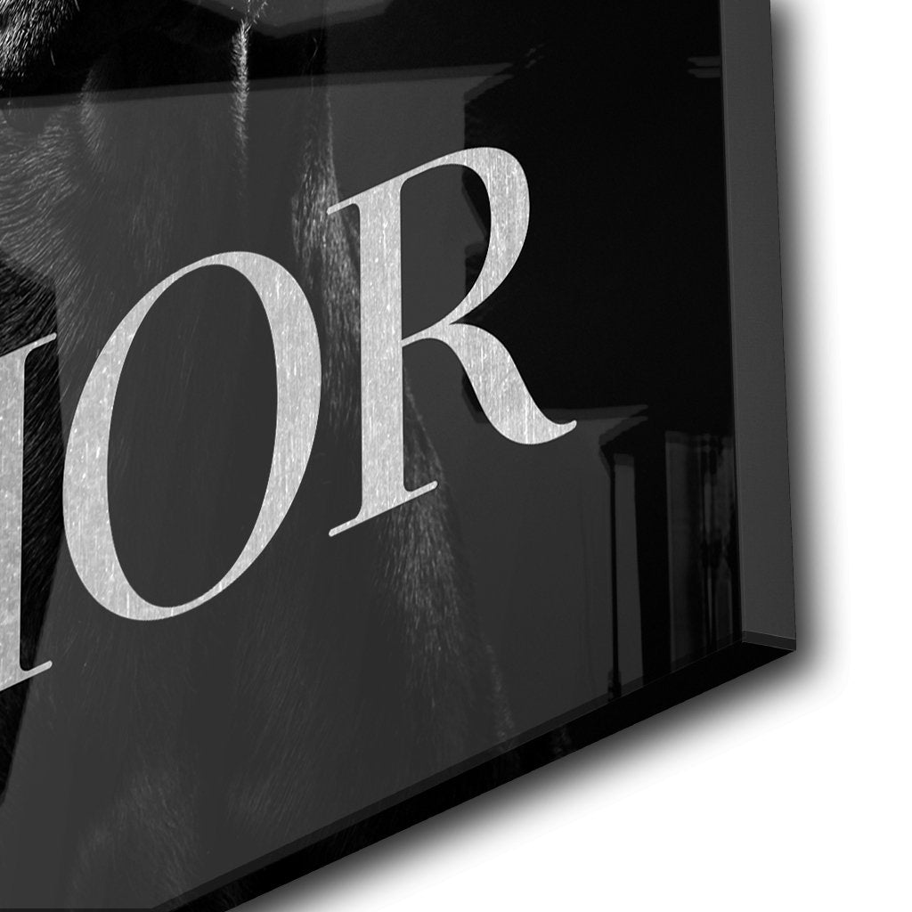 Ein eindrucksvolles Schwarz-Weiß-Foto zeigt einen Dobermann in Nahaufnahme. Im unteren Bildbereich prangt groß der Schriftzug "DIOR" in Silber. Diese Kombination aus dem eleganten Hund und der renommierten Marke strahlt zeitlose Raffinesse und Stil aus. Ein Bild, das die Schönheit der Tierwelt mit dem Glamour der Mode verbindet.