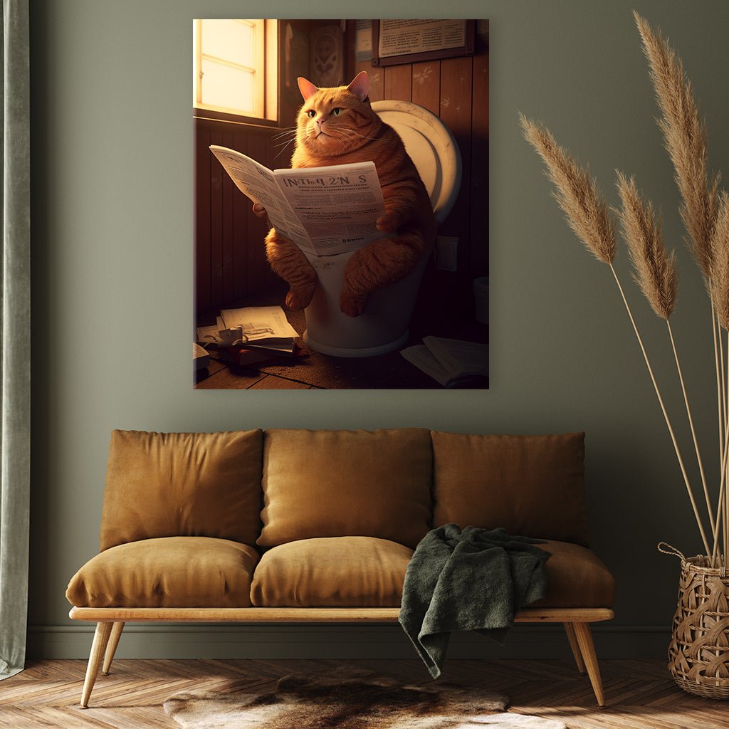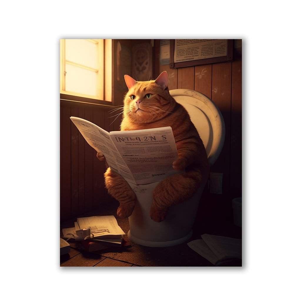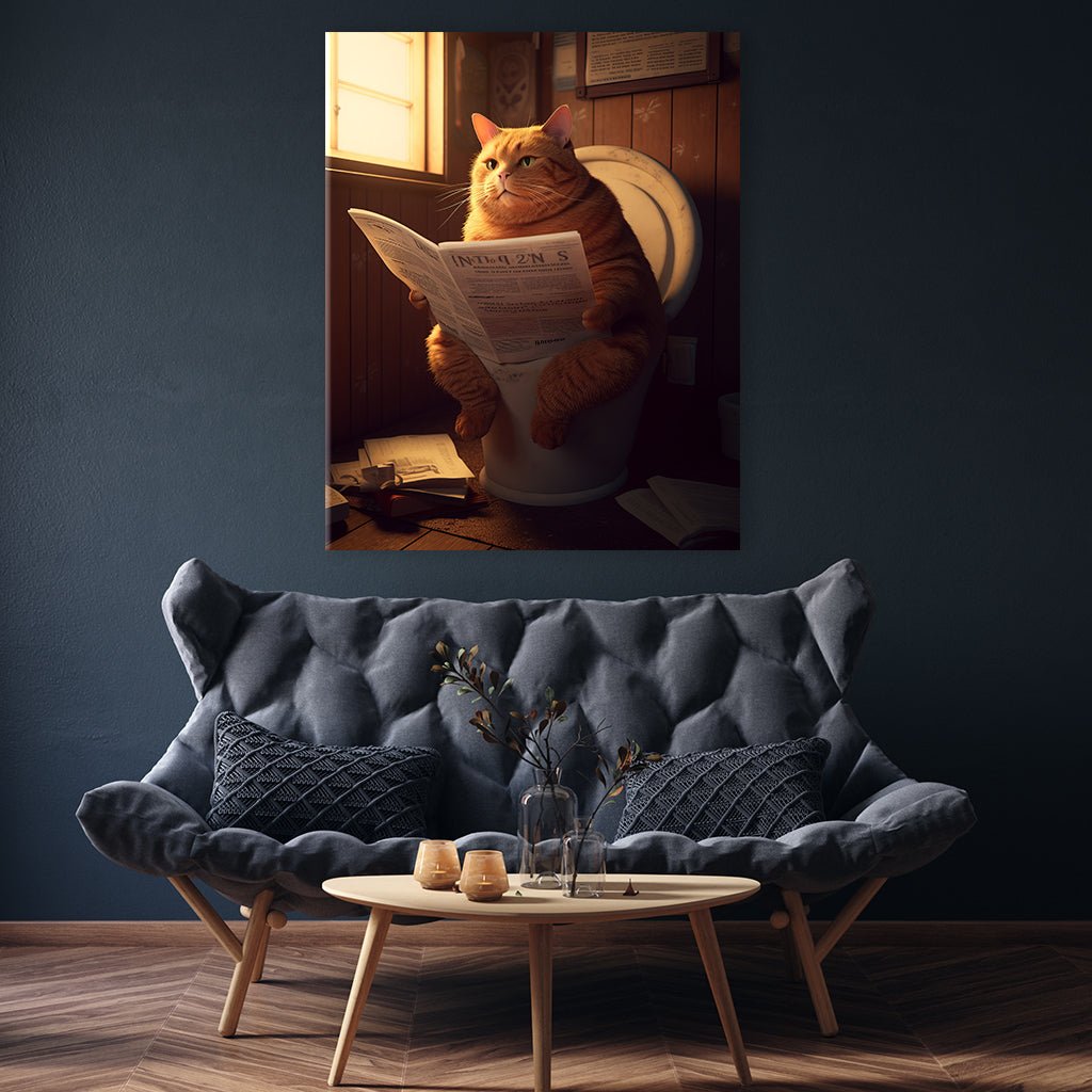 Erlebe die kuriose Szene einer Katze, die auf der Toilette sitzt und mit großer Ernsthaftigkeit eine Zeitung in den Pfoten hält. Diese humorvolle Darstellung ist ein wahrer Blickfang und bringt garantiert jeden zum Schmunzeln. Das Bild verbindet den charmanten Katzenblick mit einer unerwarteten Situation und sorgt für eine lustige Atmosphäre in jedem Raum. Ob im Wohnzimmer, Schlafzimmer, Flur oder sogar im Badezimmer, dieses Motiv ist ein witziger Hingucker.