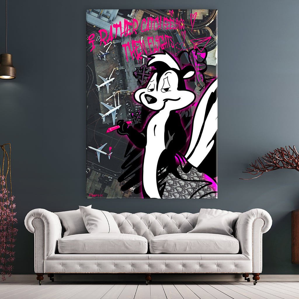 Das Bild zeigt Pepé, den charmanten Stinktiercharakter der Looney Tunes, mit seinem schelmischen Blick. Im Hintergrund ein Flugplatz von oben und einem Text in leuchtendem Pink: "I rather catch feelings than flights". Der Satz vermittelt die Botschaft über die Prioritäten im Leben nachzudenken.