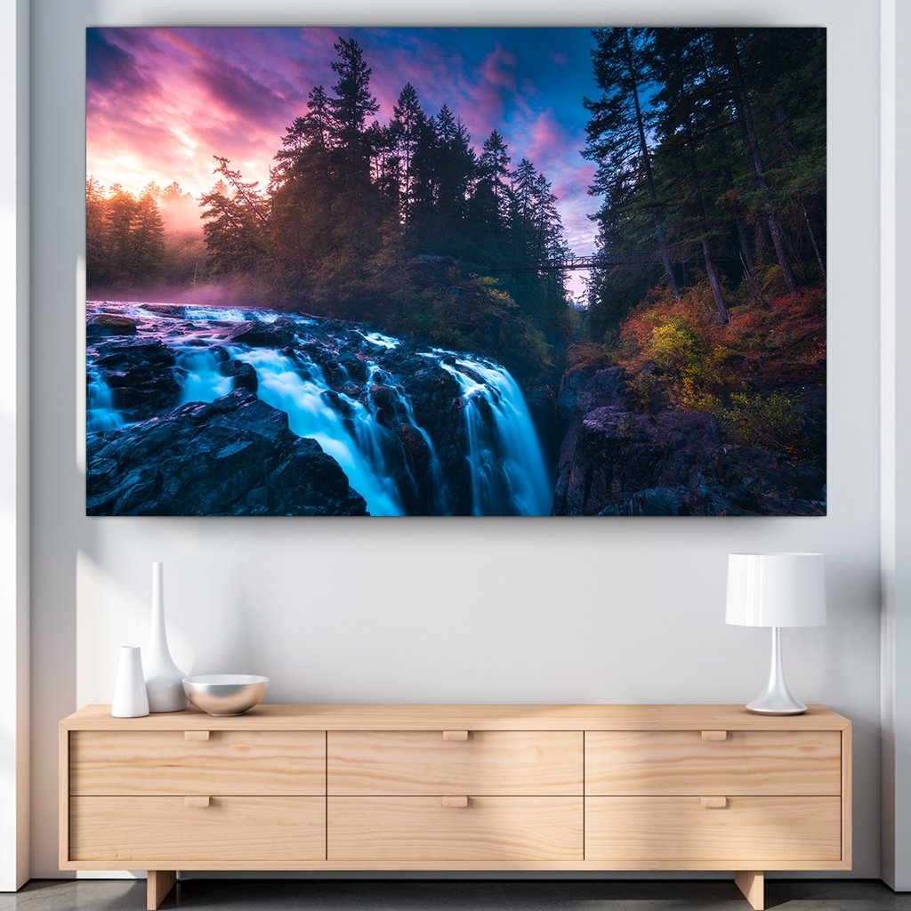 Die Motivbeschreibung entführt uns in eine bezaubernde natürliche Szenerie. Inmitten eines dichten Waldes erstreckt sich ein majestätischer Wasserfall. Das atemberaubende Farbenspiel der Natur wird durch das Lichtspiel der Sonne verstärkt, das durch den Wald dringt und auf das sprudelnde Wasser trifft. Dieses Motiv lädt den Betrachter ein, die ruhige und zugleich dynamische Schönheit der Natur zu bestaunen und sich von ihrer Pracht verzaubern zu lassen.