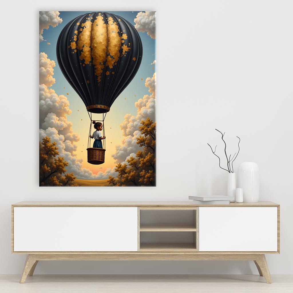Das Bild zeigt ein märchenhaftes Motiv einer jungen Mädchenfigur, die in einem kleinen Korb unter einem Heißluftballon steht. Der Ballon ist schwarz mit goldenen Akzenten, die wie verstreute Blütenblätter wirken. Die Szene spielt sich in einer verträumten Atmosphäre ab, umgeben von weichen Wolken und warmem, goldenem Licht, das eine friedliche, fast magische Stimmung erzeugt.