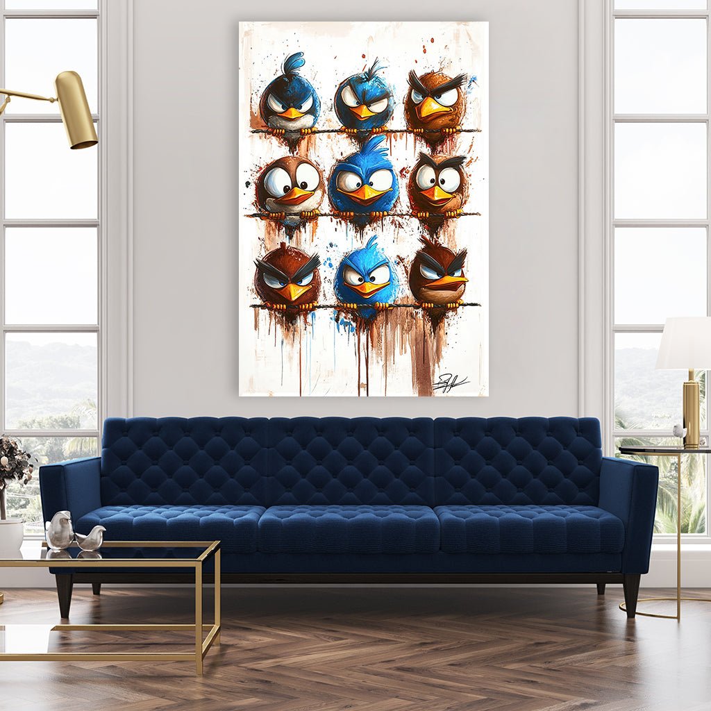 Dieses lebhafte Bild zeigt neun ausdrucksstarke Cartoon-Vögel, die in drei Reihen auf Drähten sitzen. Jeder Vogel hat eine einzigartige Persönlichkeit, die durch seine ausdrucksstarken Augen, Augenbrauen und Schnäbel zum Ausdruck kommt. Die Farbpalette ist kräftig und lebendig, wobei Blau-, Braun- und Orangetöne dominieren. Das Bild hat einen hellen und luftigen Hintergrund, der die Vögel in den Mittelpunkt rückt.