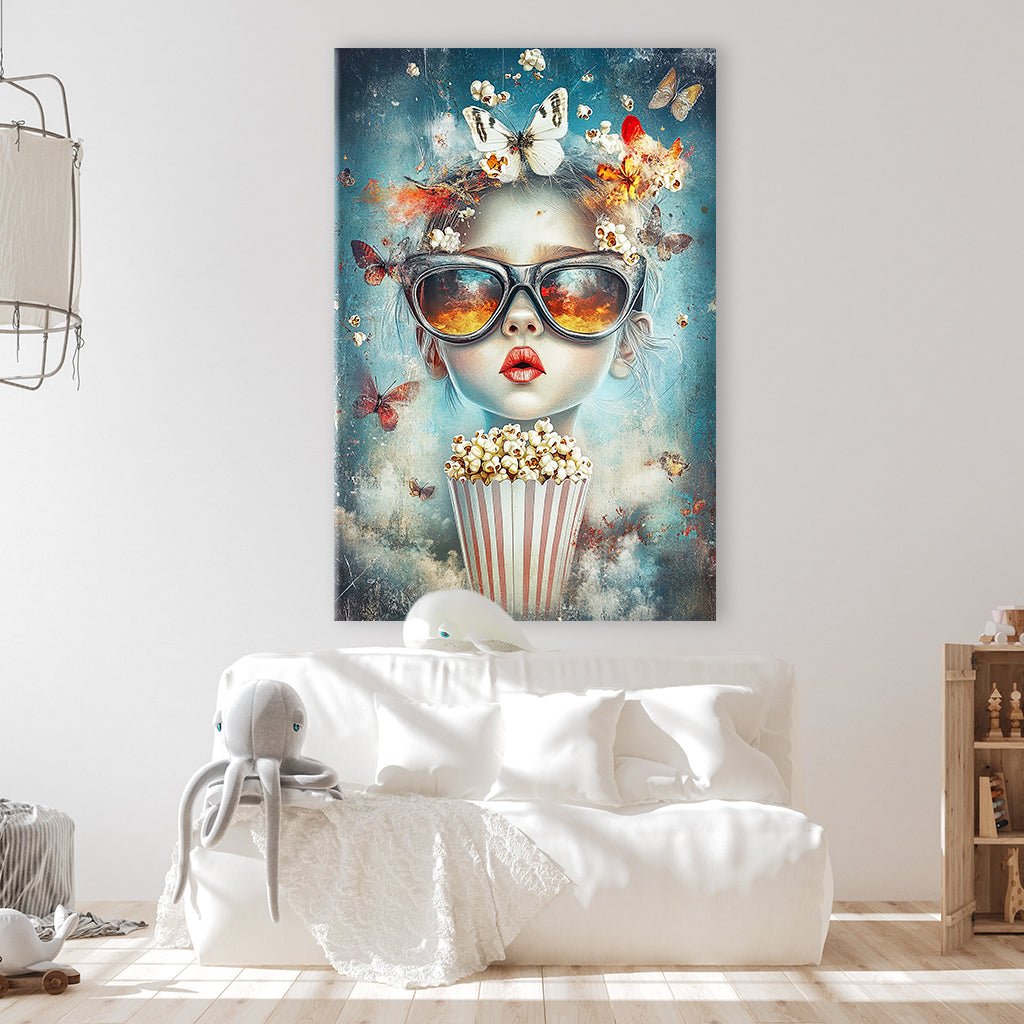 Dieses bezaubernde Bild zeigt ein aufgewecktes Mädchen mit großen Sonnenbrille und Popcorntüte, die in einer verträumten und märchenhaften Umgebung präsentiert wird. Sie scheint im Kino zu sitzen, in den Film vertieft und taucht sinnbildlich in ihn ein. Die Schmetterlinge um sie herum und die Pastelltöne sind in sanften und verträumten Stil gestaltet.