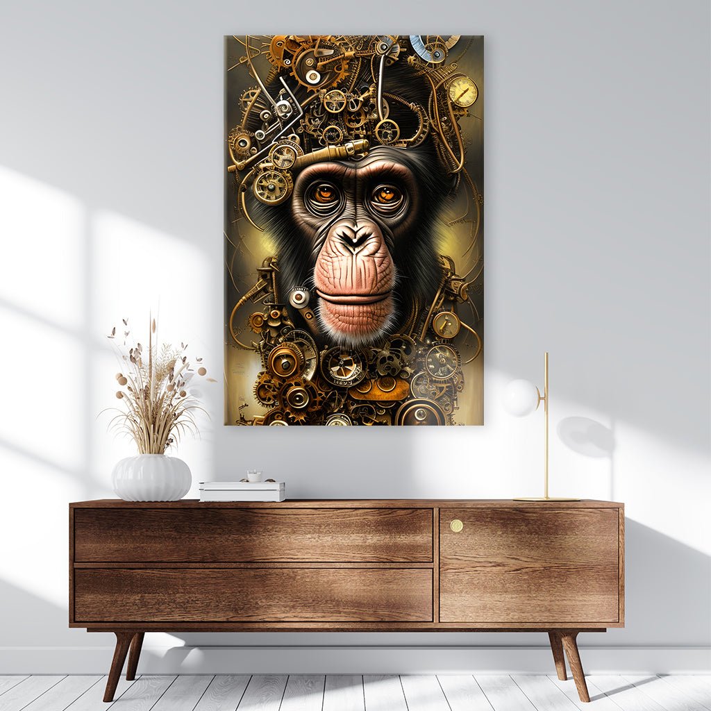 Ein Steampunk-Affe wird zum faszinierenden Meisterwerk, dessen Fell von einem komplexen Uhrwerk mit Zahnrädern durchzogen ist. Diese künstlerische Verschmelzung von Technologie und Natur schafft eine einzigartige Ästhetik. Der Steampunk-Stil verleiht dem Affen eine mechanische Eleganz, während das Uhrwerk mit seinen Zahnrädern eine hypnotische Bewegung darstellt.