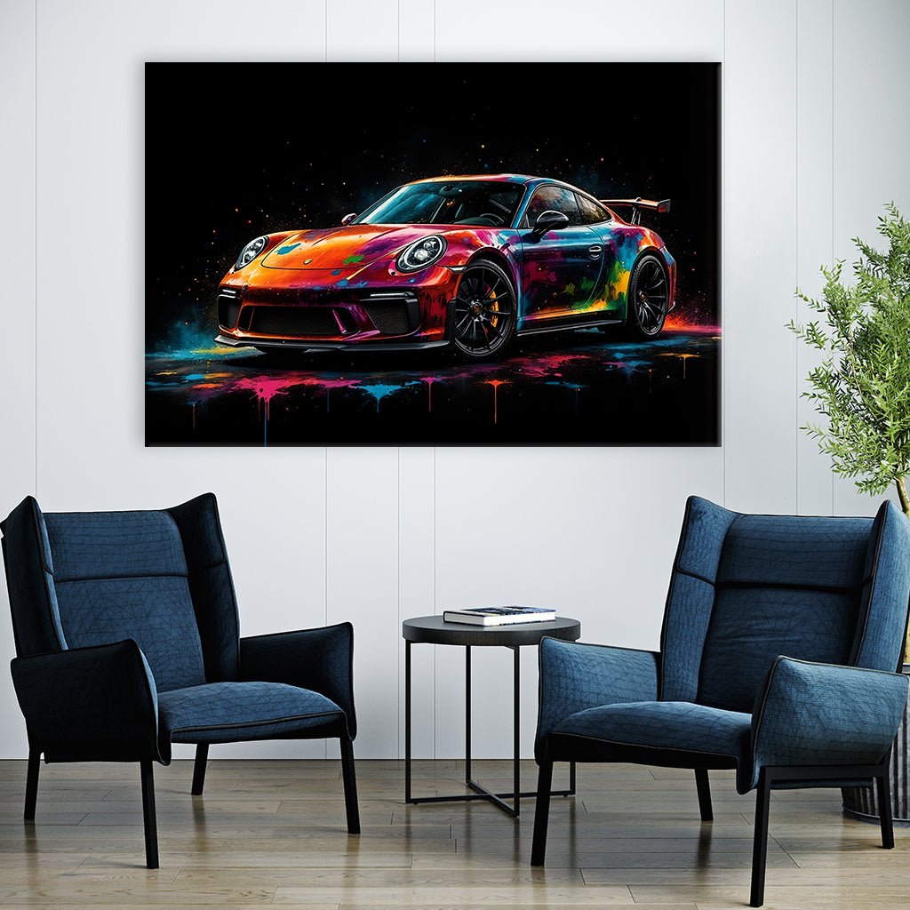 Dieses farbenfrohe Bild zeigt einen klassischen Porsche 911, der mit bunten Farbspritzern bedeckt ist. Die Farbspritzer sind in einem dynamischen und expressiven Stil aufgetragen, was ein Gefühl von Energie und Bewegung erzeugt. Das Bild hat einen dunklen Hintergrund, der es dem Auto ermöglicht, sich abzuheben.