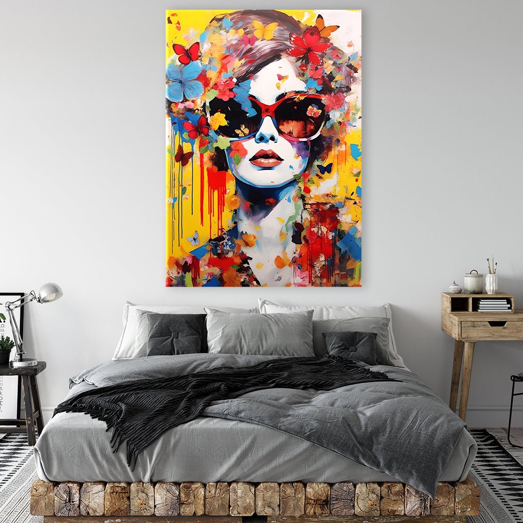 Eine Frau mit großer Sonnenbrille erstrahlt im Streetartstil. Bunte Blumen und verspielte Schmetterlinge umrahmen sie als künstlerische Elemente. Die Streetart-Ästhetik verleiht dem Bild eine jugendliche und moderne Note. Ob im Wohnzimmer, Schlafzimmer oder Flur, dieses Bild wird zum inspirierenden Blickfang und bringt Leben in jeden Raum.