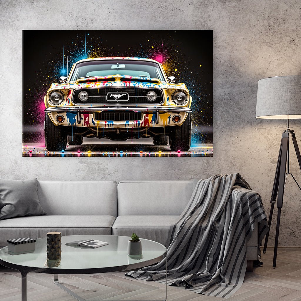 Dieses farbenfrohe Bild zeigt einen klassischen Ford Mustang, der mit bunten Farbspritzern bedeckt ist. Die Farbspritzer sind in einem dynamischen und expressiven Stil aufgetragen, was ein Gefühl von Energie und Bewegung erzeugt. Das Bild hat einen dunklen Hintergrund, der es dem Auto ermöglicht, sich abzuheben.
