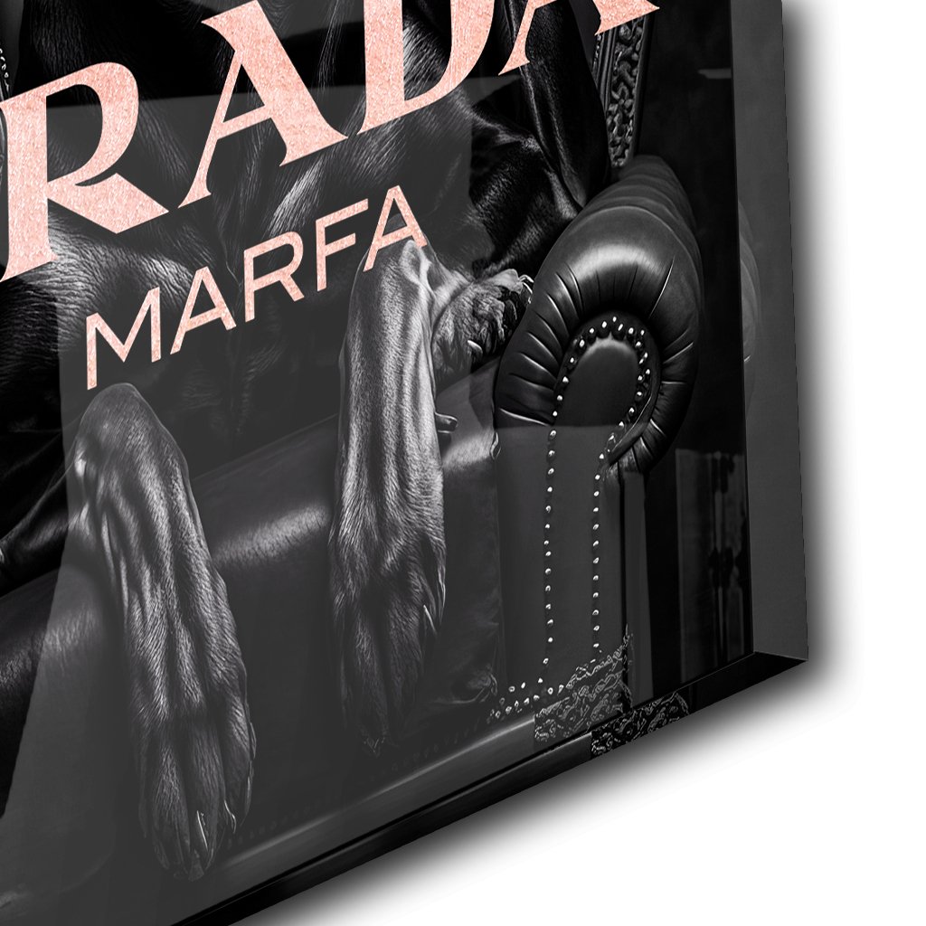 Ein eindrucksvolles Schwarz-Weiß-Bild zeigt einen stolzen Dobermann, der auf einem edlen Chesterfield Stuhl thront. Im unteren Bildbereich prangt der prägnante Schriftzug "PRADA" der mit Roségold veredelt wird.