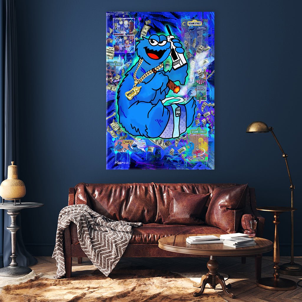 Das Krümelmonster zeigt sich hier als geschäftiger Businesstyp. Am Telefon, mit einer Zigarre in der Pfote und Goldkette. Im Hintergrund Comicausschnitte und Dollarnoten die seine Erfolge zelebrieren. Ein Bild von Ehrgeiz und Raffinesse, ganz im Stil einer erfolgreichen Cartoon-Geschäftswelt.
