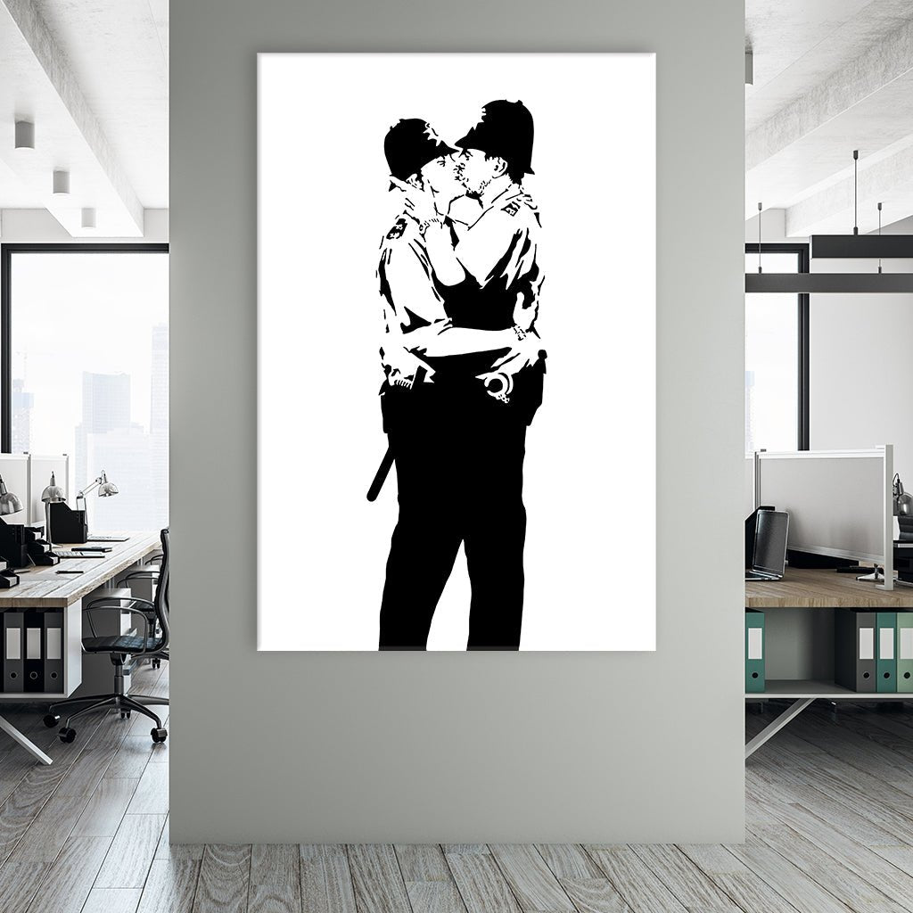 Sur un fond blanc, deux policiers anglais sont représentés en silhouette noire. Les deux policiers s'embrassent tendrement. Cela nous rappelle que l'amour ne connaît pas de limites et que chacun a le droit d'exprimer son amour, indépendamment de son genre, de sa race ou de sa profession.