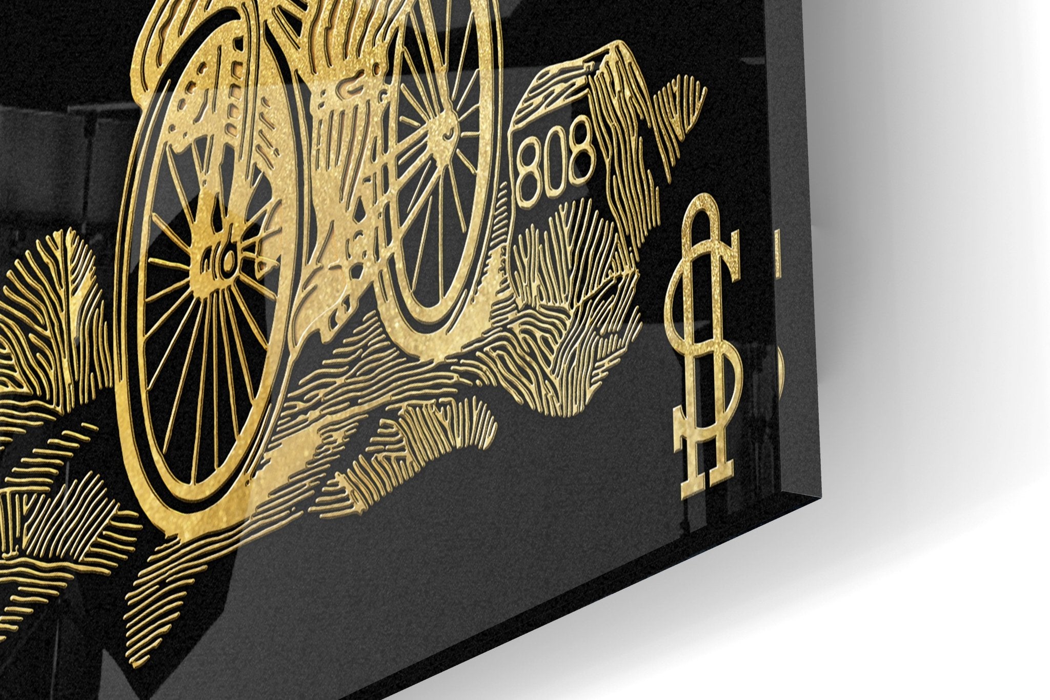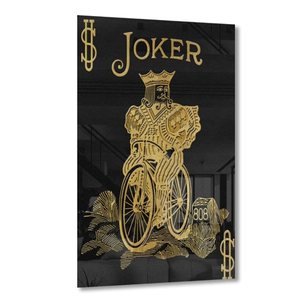 Das Kunstwerk "Joker by Frank Amoruso Goldversion auf Acryl" ist ein beeindruckendes und ungewöhnliches Motiv. Der Joker, eine der vielseitigsten Figuren aus dem Kartenspiel, wurde hier auf einem Fahrrad dargestellt.