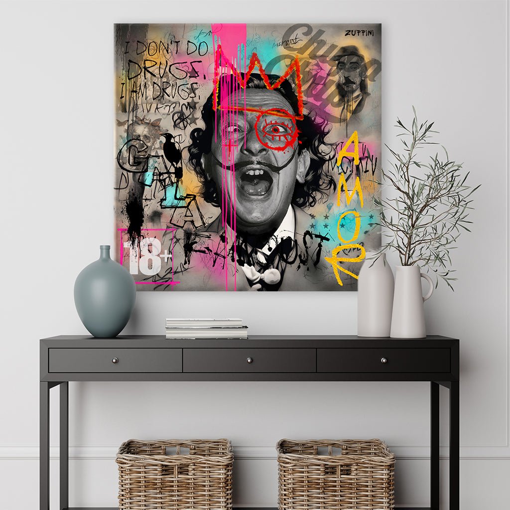 Das Bild zeigt ein dramatisch überlagertes, schwarz-weißes Porträt von Salvador Dali mit weit geöffnetem Mund und einem roten, stilisierten Auge. Er trägt eine leuchtend rote und pinke Krone. Umgeben ist das Porträt von chaotischen Graffiti-Elementen, darunter "I DON'T DO DRUGS, I AM DRUGS", Schmetterlingen und abstrakten Farbspuren.