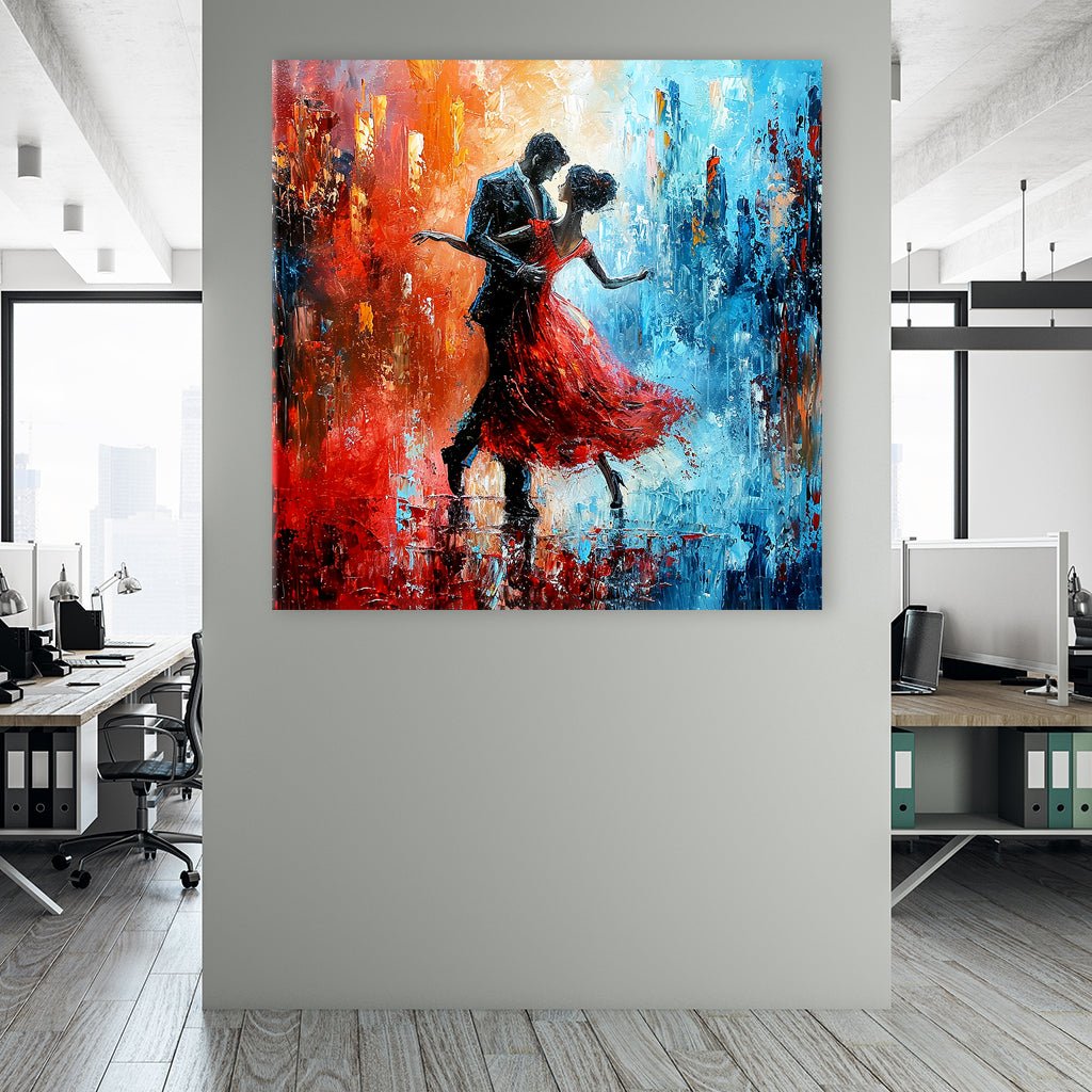 Das Bild zeigt ein leidenschaftliches Tango tanzendes Paar, eingefangen im dynamischen Stil eines Acrylgemäldes. Die Farbtöne Rot und Blau dominieren die Szene und fließen von links nach rechts harmonisch ineinander, wodurch ein fesselnder Farbverlauf entsteht, die die Bewegung und die Emotion des Tanzes unterstreichen.