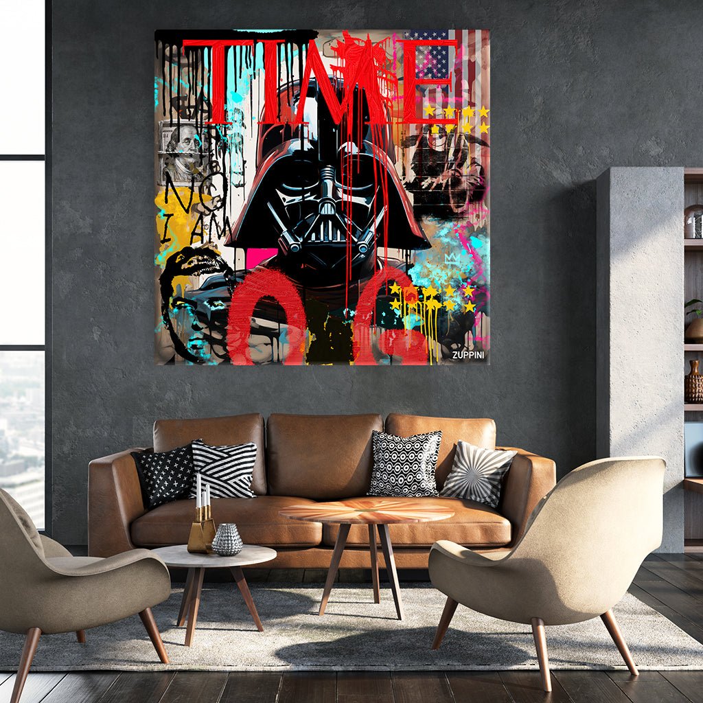 Darth Vader zentral im Bild, umgeben von einem lebhaften Mix aus Graffiti und Collagen-Elementen. Auffällig sind das große rote "TIME"-Logo oben, die tropfenden Farben und weitere Schriftzüge und Symbole wie eine US-Flagge und gelbe Sterne.