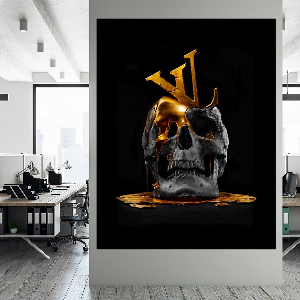 Dieses moderne Motiv zeigt einen Totenschädel auf schwarzem Hintergrund in dem das Initialen-Logo der Luxusmarke Louis Vuitton steckt. Eine goldene Flüssigkeit läuft aus dem Schädel heraus.