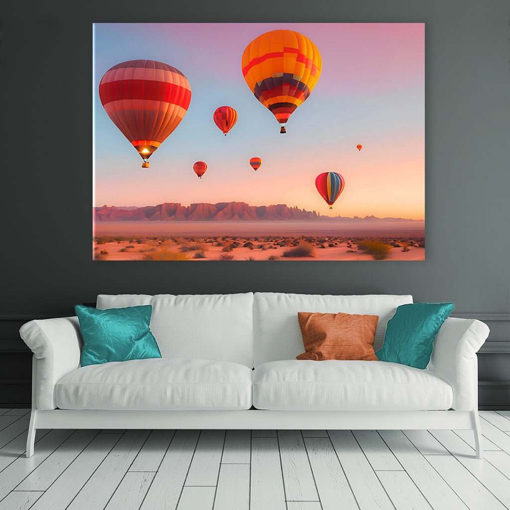 Eine Vielzahl bunter Heißluftballons schwebt am Himmel über einer atemberaubenden Wüstenlandschaft. Die farbenfrohen Ballons, in lebendigen Tönen wie Rot, Gelb, Blau und Grün, bilden einen faszinierenden Kontrast zu den warmen, goldenen Sanddünen der Wüste, die sich endlos in die Ferne erstrecken. Der Himmel ist klar und weit, wodurch die Ballons in verschiedenen Höhen majestätisch schweben.