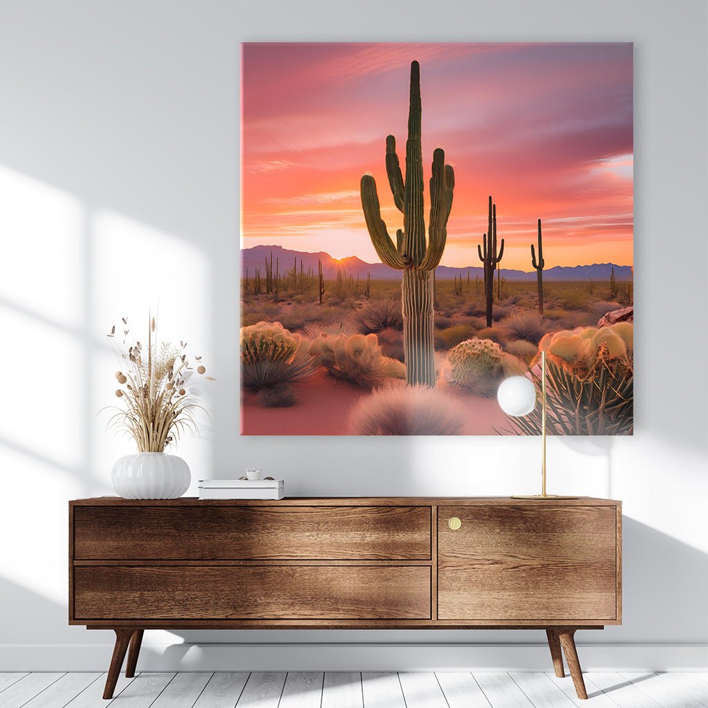 Ein majestätischer Kaktus steht im Mittelpunkt einer weitläufigen Wüstenlandschaft, die im warmen Licht des Sonnenuntergangs erstrahlt. Der Himmel leuchtet in intensiven Orange- und Rosatönen, während die letzten Sonnenstrahlen die umliegenden Pflanzen und die entfernten Berge sanft beleuchten. Die Szenerie ist ruhig und zeitlos, mit einer eindrucksvollen Darstellung der unberührten Natur der Wüste, die eine friedliche, fast magische Atmosphäre vermittelt.