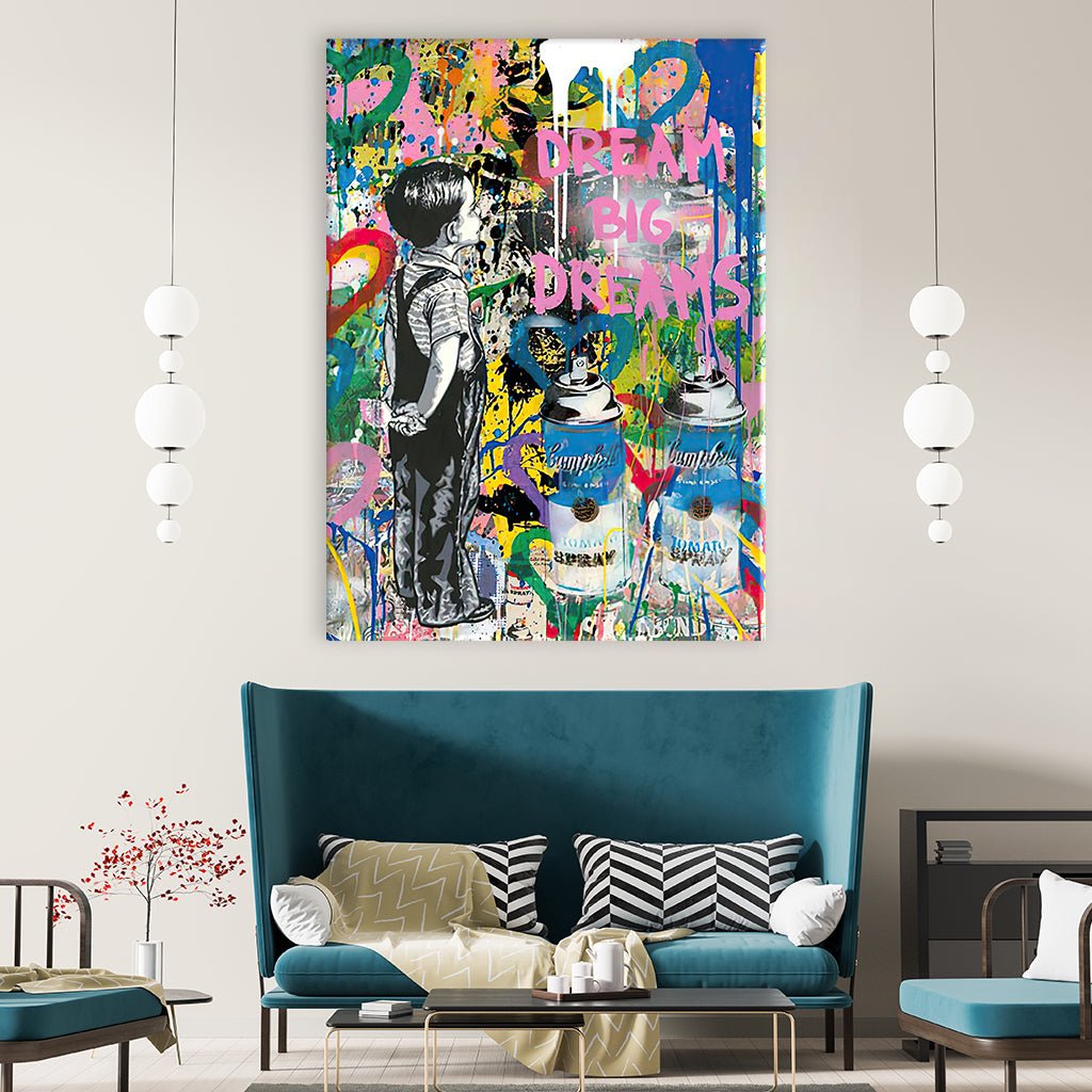 Le motif représente une œuvre de Banksy réalisée avec sa technique de pochoir, montrant un petit garçon tenant un pinceau et ayant peint l'inscription "Dream Big Dreams" en rose sur un mur. En arrière-plan, un mur de graffitis aux couleurs vives.