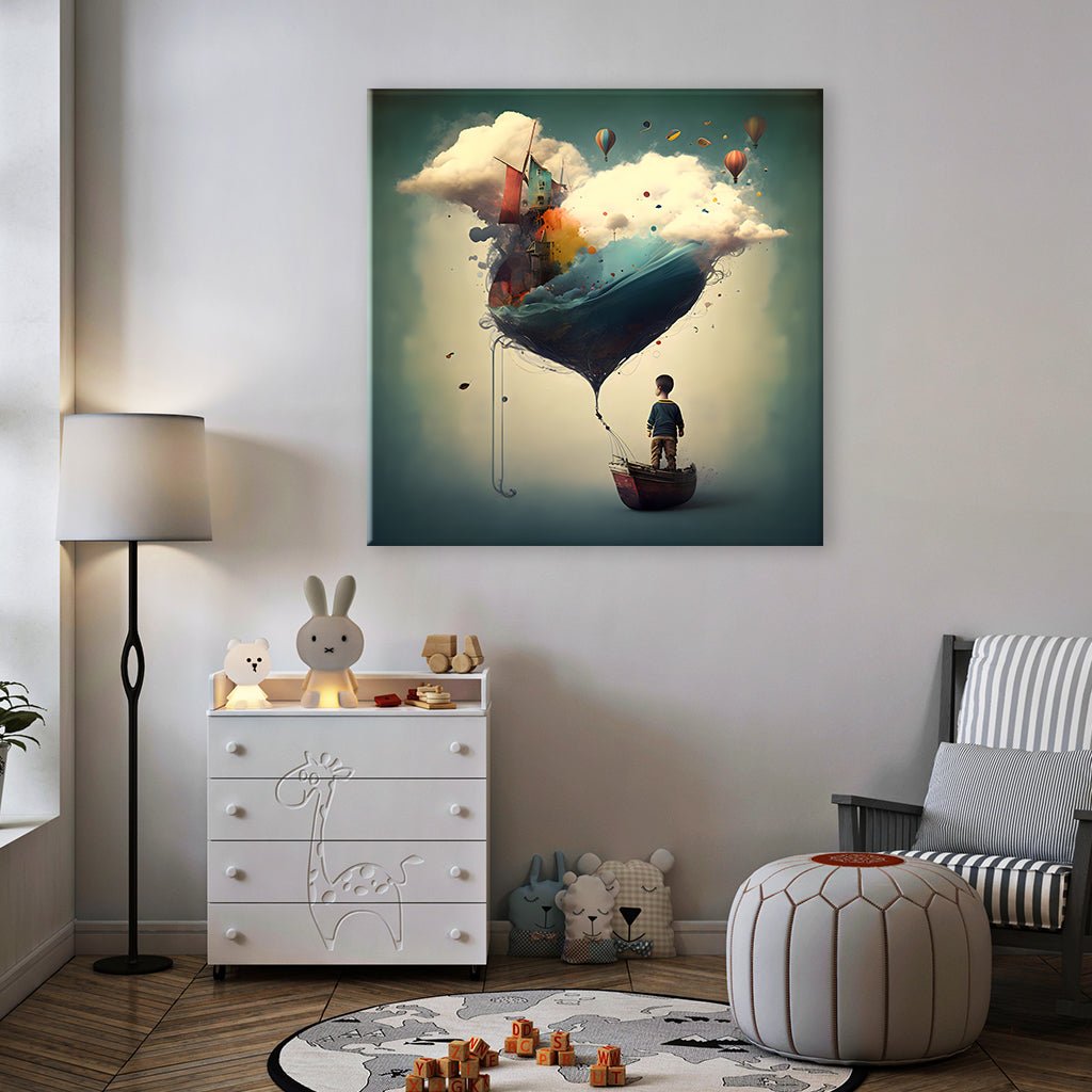 Cette œuvre d'art représente un enfant debout sur une barque, tandis qu'une magnifique bulle de rêves flotte au-dessus de lui. Dans cette bulle, on aperçoit un paysage pittoresque composé d'eau, d'un moulin à vent et de montgolfières colorées. La combinaison de la représentation réaliste de l'enfant et de la représentation abstraite de la bulle de rêves crée une atmosphère unique et fascinante.