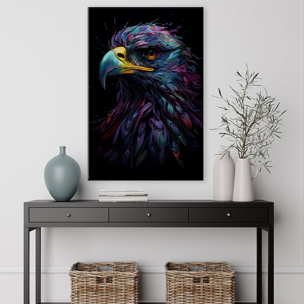 Viele kleine bunte Farbkleckse und Striche ergeben diesen tollen Adler, der auf einem schwarzen Hintergrund zu sehen ist. Die vielen kleinen Farbkleckse ergeben ein einzigartiges Kunstwerk, das die Schönheit der Dame und die Kreativität des Künstlers auf wunderbare Weise vereint.